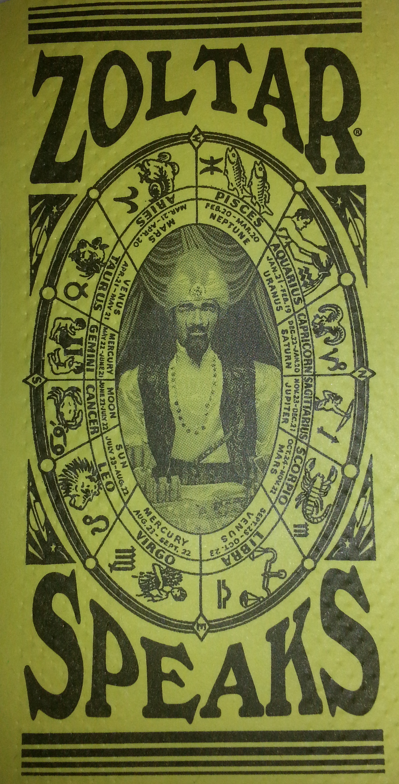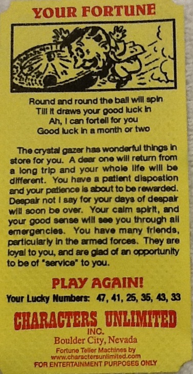 You'll never guess who I met. Yes, I met Z, well, Zoltar. His blue eyes were simply captivating for me and I had to get a "reading." I inserted my dollar. He gestured and moved his hands over the crystal ball, and cards. Then, out came my fortune.